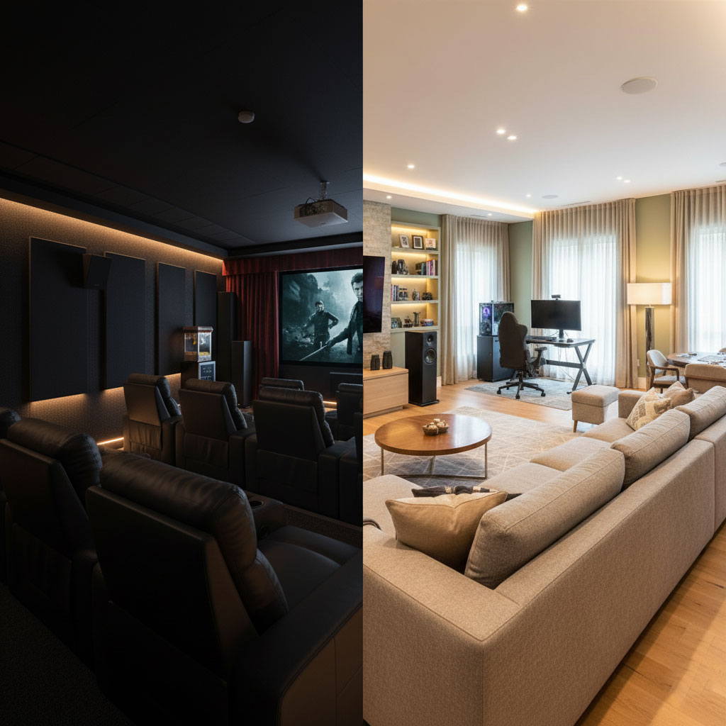 • Space Requirements: Dedicated cinemas work best in basements, lofts, or unused rooms, while media rooms can fit into everyday living spaces.